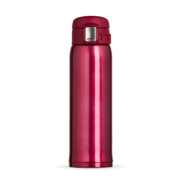 Descrição: Garrafa térmica de 450ml de metal inteira colorida com botão de abertura prata. Possui um sistema de trava com desenho indicativo de cadeados(basta mover para os lados para abrir/fechar), pressione o botão centra para abrir a tampa (possui na parte interna borracha protetora evitando vazar o líquido). Para abrir a tampa por completo basta rosqueá-la, parte interna revestida em inox.