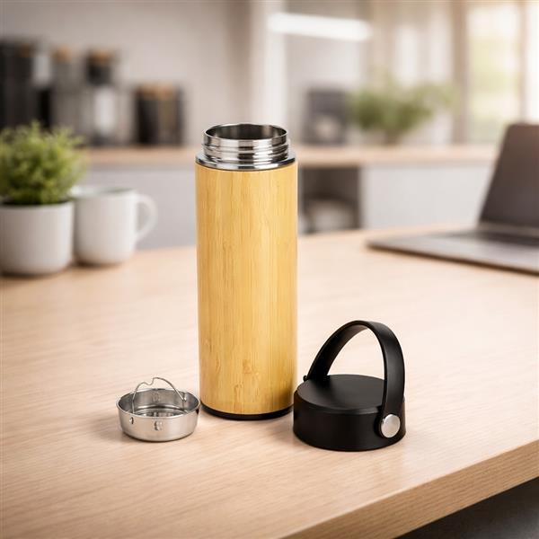 Garrafa térmica com capacidade máxima de 400 ml. Possui estrutura de parede dupla com revestimento externo em bambu e parte interna em inox 304. Conta com tampa rosqueável em polipropileno (PP) com alça para transporte. Acompanha cesto infusor com alça em inox 304. Altura : 21 cm Largura : 8,1 cm Circunferência : 22 cm Diâmetro : 5,5 cm Peso aproximado (g): 324
