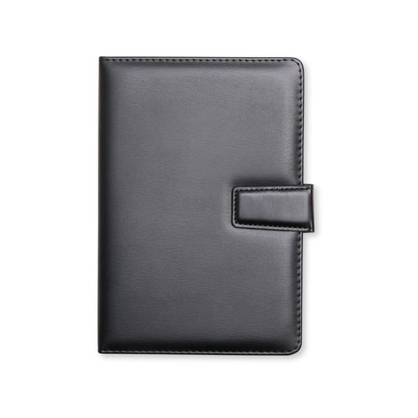 Kit executivo com duas peças, composto por uma caderneta de capa em couro sintético com fechamento magnético e cerca de 20 folhas pautadas, e uma caneta em metal com detalhes em plástico, ponteira emborrachada para uso em dispositivos touchscreen e carga esferográfica azul de 1,0 mm. Acompanha uma caixa de papelão com berço em espuma para a caneta.