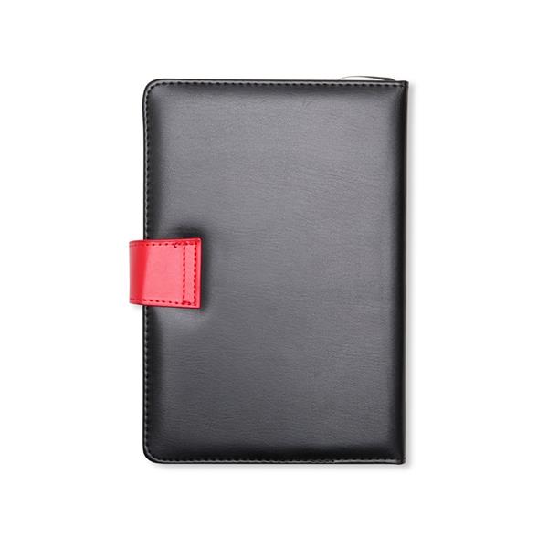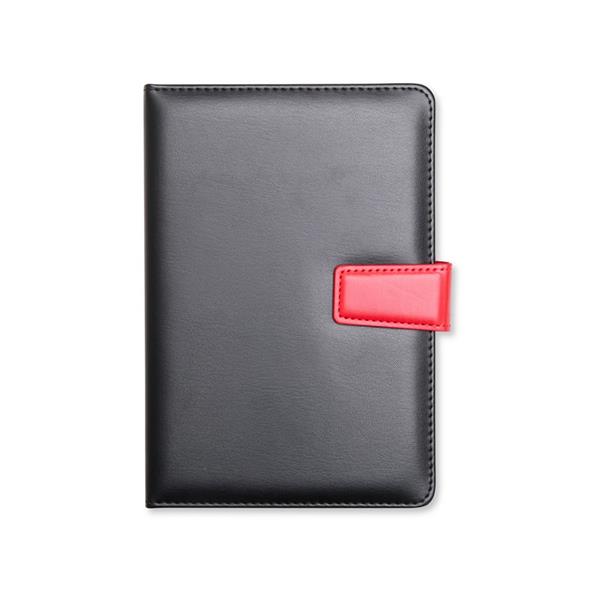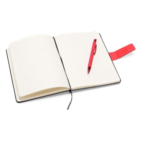 Kit executivo com duas peças, composto por uma caderneta de capa em couro sintético com fechamento magnético e cerca de 20 folhas pautadas, e uma caneta em metal com detalhes em plástico, ponteira emborrachada para uso em dispositivos touchscreen e carga esferográfica azul de 1,0 mm. Acompanha uma caixa de papelão com berço em espuma para a caneta. Largura : 21 cm Profundidade : 2,7 cm Comprimento : 22,5 cm Tamanho total aproximado (CxL): Caderno (C X L X E): 22,5 cm x 21 cm x 2,7 cm Caneta (C X L): 14 cm x 1,4 cm Peso aproximado (g): 462