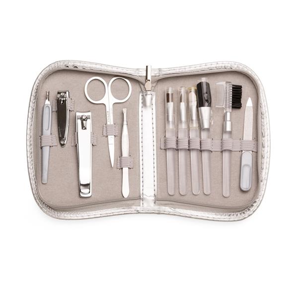 Kit manicure 11 peças em estojo de couro sintético. Possui: empurrador de cutícula, cortador de cutícula, cortador de unha, tesoura, pinça, pincel corretivo, pincel para sobrancelha, pincel para sombra, pincel para blush, pente para sobrancelha e lixa. Estojo de couro sintético com parte interna revestida com veludo e elásticos de nylon para fixar as peças. Medidas aproximadas para gravação (CxL): 13,5 cm x 9,8 cm Tamanho total aproximado (CxL): 15,8 cm x 11,2 cm x 3 cm Peso aproximado (g): 157