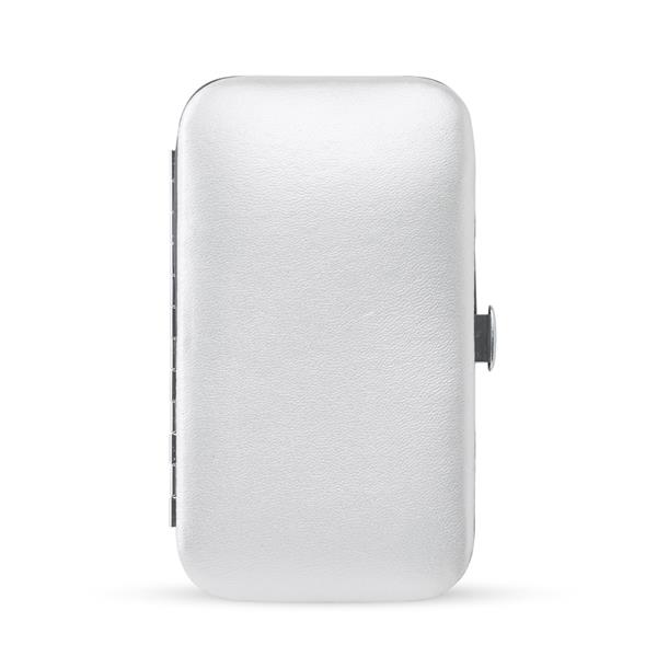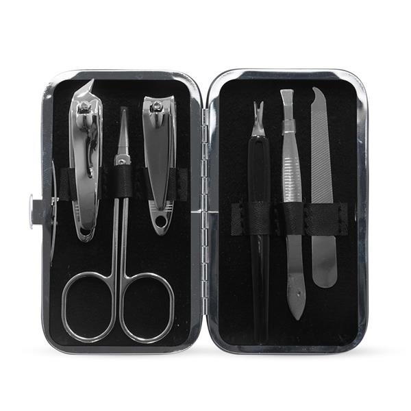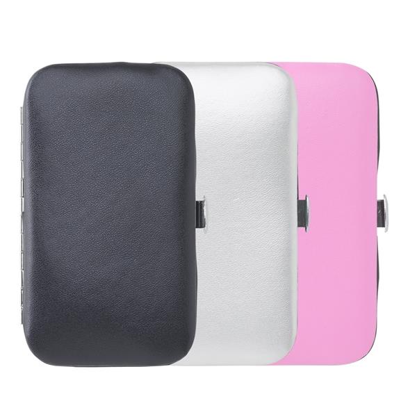 Kit manicure 6 peças em estojo de couro sintético. Possui: lixa, pinça, empurrador de cutícula, cortador de cutícula, tesoura e cortador de unha. Parte interna revestido de veludo com suporte de couro para fixar as peças. Para abrir o estojo basta apertar o botão central. OBS.: APENAS NA COR PRETA O VELUDO INTERNO É PRETO! Medidas aproximadas para gravação (CxL): 5,2 cm x 9,5 cm Tamanho total aproximado (CxL): 10,3 cm x 6,2 cm Peso aproximado (g): 87