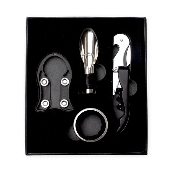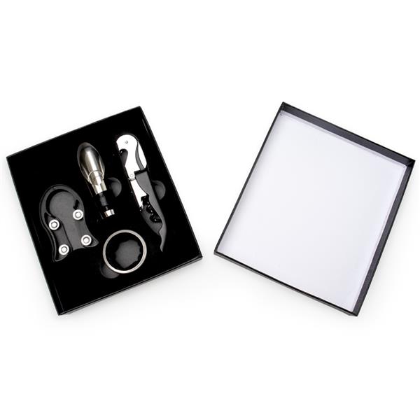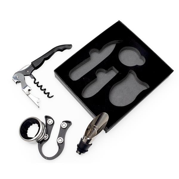 Kit vinho 4 peças em estojo de papelão com berço espumado. Possui wine collar, bico condutor, cortador de lacre e saca rolhas.