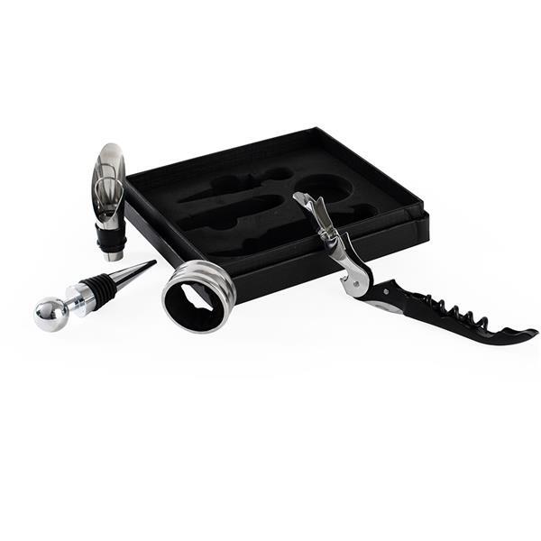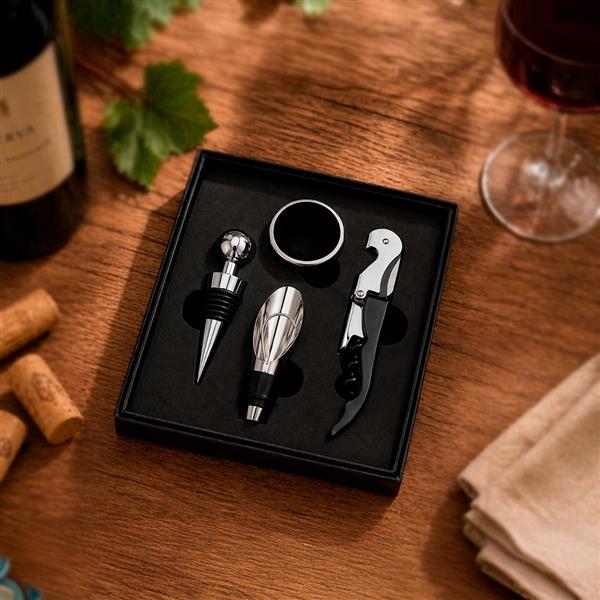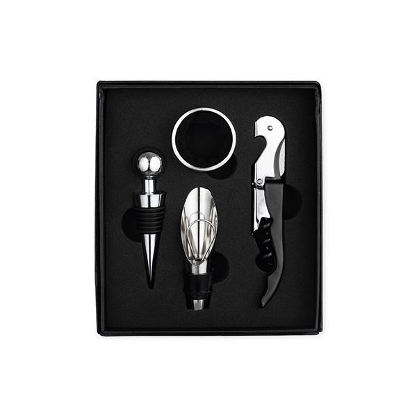 Kit vinho composto por 4 itens: saca-rolhas de dois estágios em inox, anel corta-gotas (wine collar) em liga de zinco e feltro, além de bico dosador e tampa de bico, ambos em liga de zinco com revestimento em silicone. Acompanha estojo em papelão e revestimento interno em espuma de EVA para acomodar os itens do conjunto.