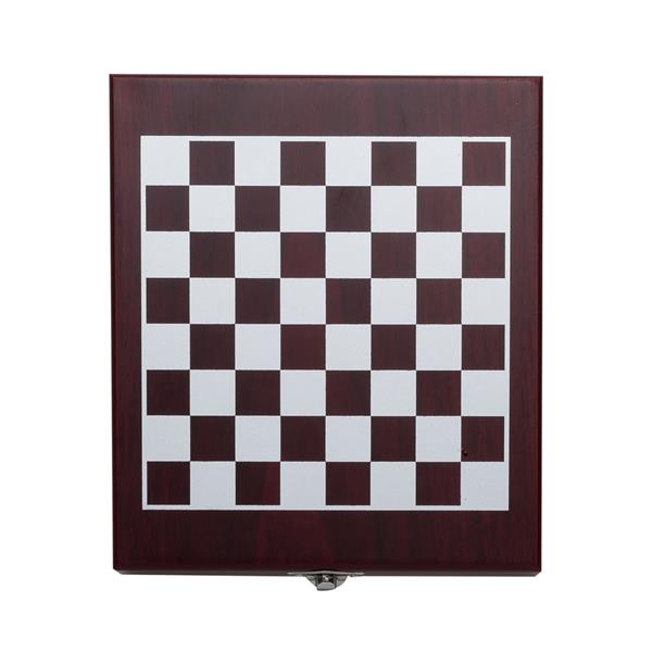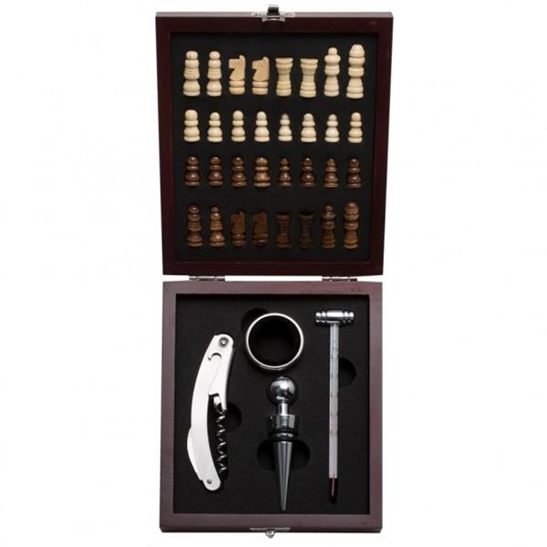 Kit vinho 4 peças em estojo tabuleiro de xadrez. Contém saca rolhas metálico com lâmina de corte e abridor de garrafa; wine collar, tampa de bico e termômetro. Estojo com trava de segurança e área interna com berço de espuma, acompanham 32 peças de xadrez. Material: MDF Comprimento: 17,7 cm Largura: 14,8 cm Espessura: 4,5 cm Medidas para gravação (A x L): 1,7 cm x 14 cm Peso: 468 g