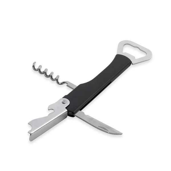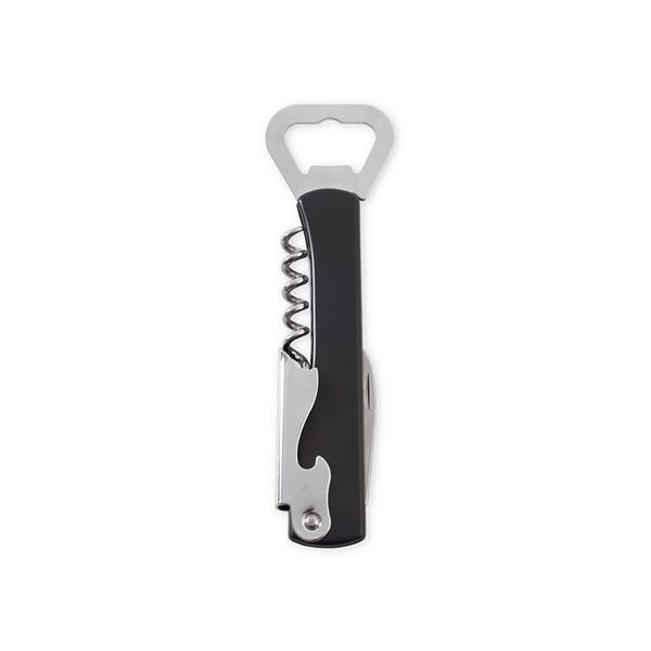 Abridor multifunções em metal com cabo revestido em plástico polipropileno (PP). Conta com abridor de tampas de garrafas, saca-rolhas de um estágio e lâmina para corte de lacres.