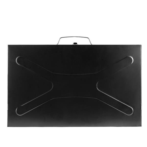 Churrasqueira feita em metal com funcionamento a carvão. Possui formato compacto e pode ser transportada como uma maleta quando desmontada, além de alça para transporte, trava de segurança para fechamento e quatro pés retráteis. Acompanha uma espátula e espeto duplo com cabo em madeira. Altura : 46 cm Largura : 26cm Comprimento : 42 cm Peso aproximado (g): 2043