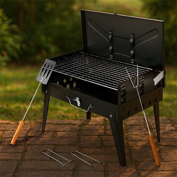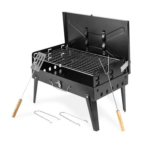 Churrasqueira feita em metal com funcionamento a carvão. Possui formato compacto e pode ser transportada como uma maleta quando desmontada, além de alça para transporte, trava de segurança para fechamento e quatro pés retráteis. Acompanha uma espátula e espeto duplo com cabo em madeira.