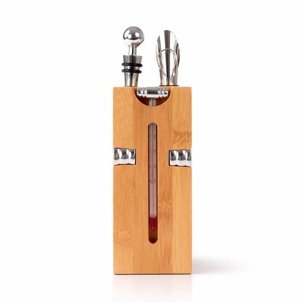 Kit vinho composto por 6 itens: saca-rolhas de um estágio em inox com cabo de bambu, dois anéis corta-gotas (wine collar) em liga de zinco e feltro, termômetro em vidro com detalhes em liga de zinco, além de bico dosador em liga de zinco com detalhes em silicone e tampa de bico em inox, com partes em zinco e silicone. Acompanha suporte em bambu para acomodar os itens do conjunto.
