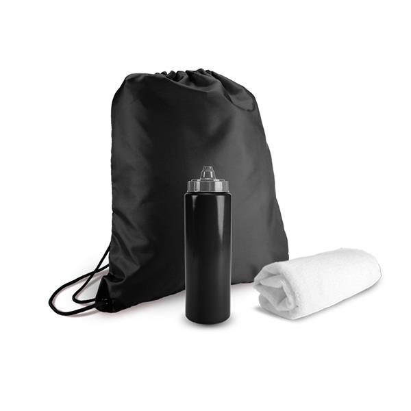 Kit esportivo 3 peças com mochila saco de nylon, squeeze plástico 950ml com tampa rosqueável e tolha inteiramente branca confeccionada em poliéster e poliamida. Altura : 41,5 cm Largura : 33,5 cm Medidas aproximadas para gravação (CxL): Mochila 38 cm x 32 cm – Squeeze 19 cm x 5 cm Tamanho total aproximado (CxL): Squeeze 25,4 cm x 7,8 cm x 24,3 cm x Toalha 79 cm x 39 cm Peso aproximado (g): 203