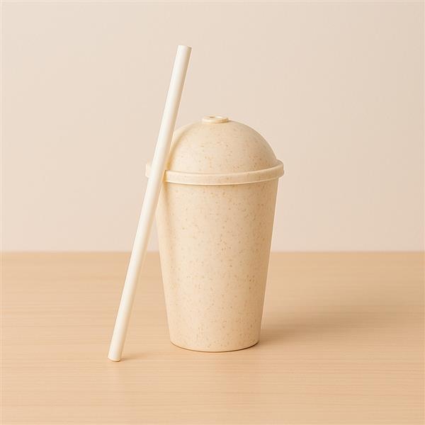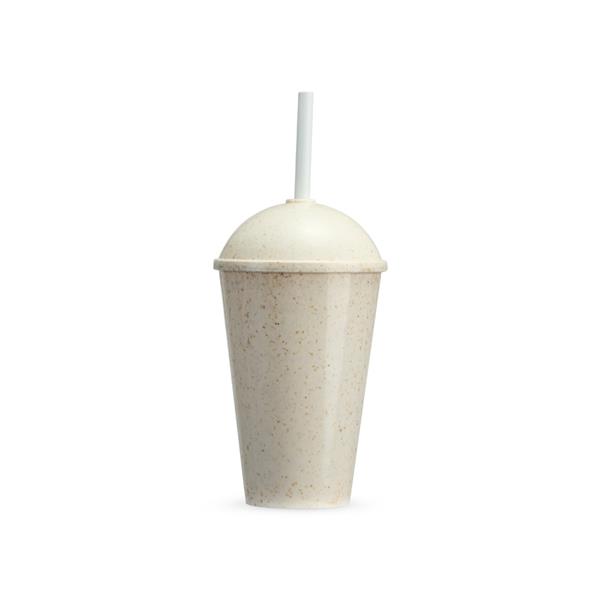 Copo produzido em fibra de madeira com tampa e capacidade de até 450 ml. Acompanha canudo plástico para encaixe na tampa.