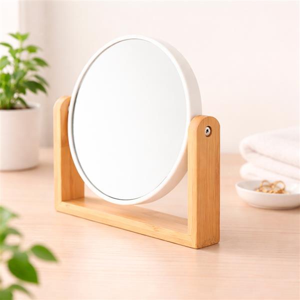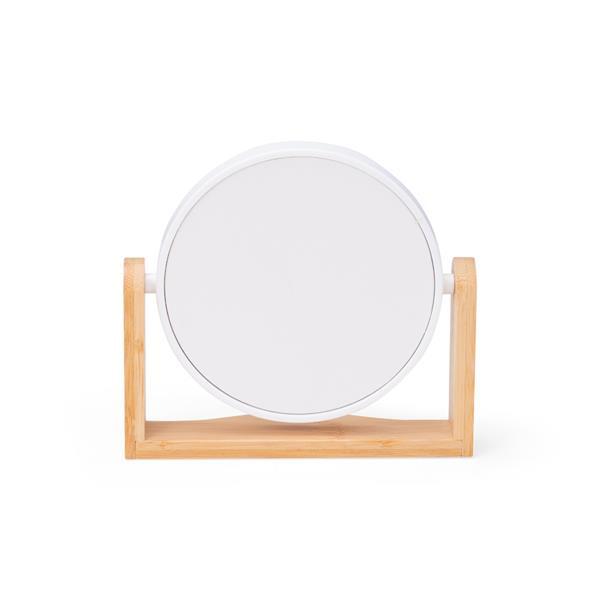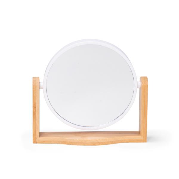 Espelho giratório com base em bambu e moldura em plástico.