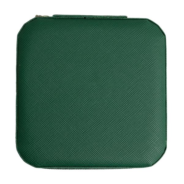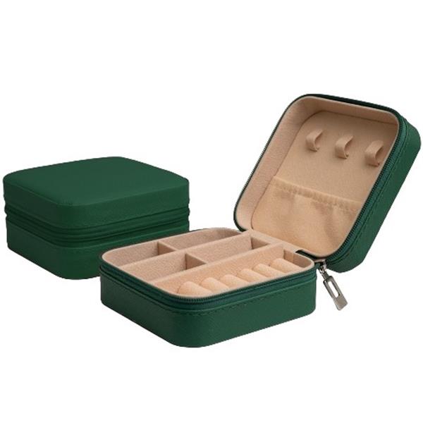 Porta joias de couro sintético com revestimento aveludado. Possui compartimentos internos para anéis, brincos, pulseiras e colares.