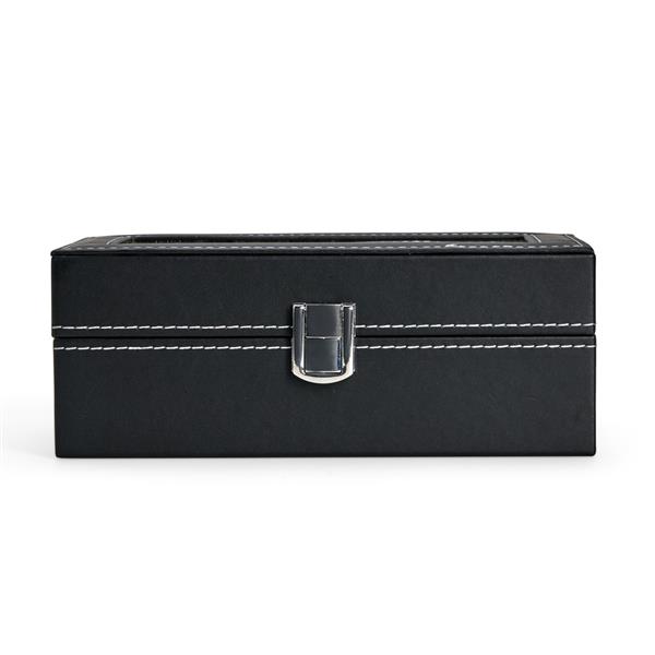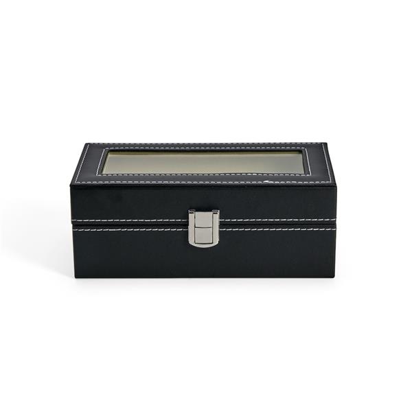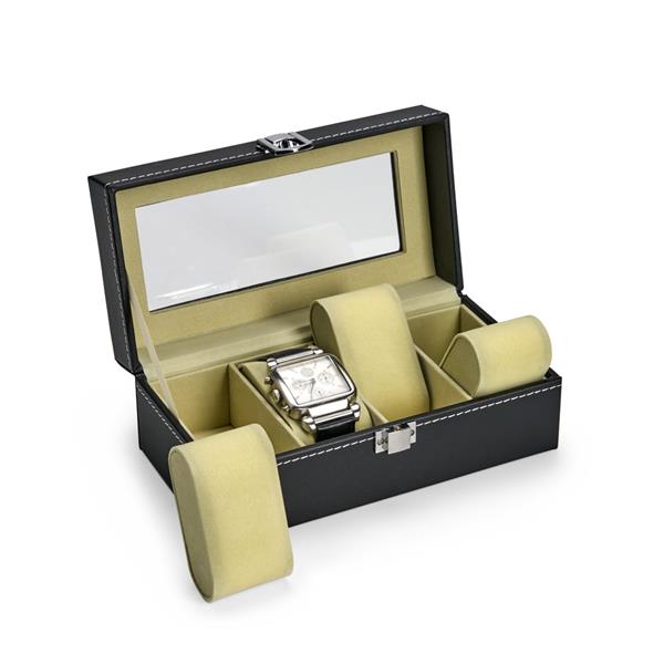 Porta relógios com acabamento em couro sintético à base de PVC. Possui revestimento interno em veludo e quatro compartimentos fixos com almofadas removíveis de espuma. Conta ainda com visor transparente em vidro e trava de segurança para o fechamento do estojo. Altura : 8 cm Profundidade : 10,7 cm Comprimento : 20,7 cm Peso aproximado (g): 420