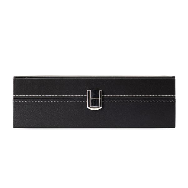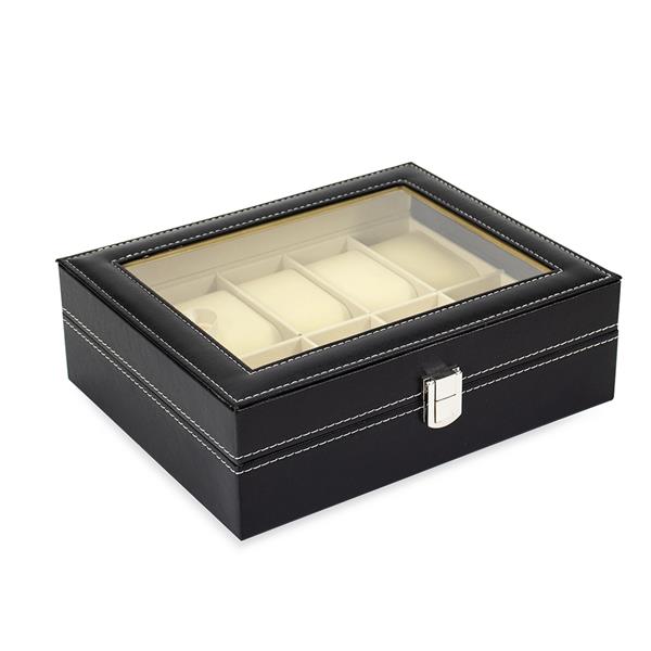 Porta relógios com acabamento em couro sintético à base de PVC e revestimento interno em veludo. Conta com 10 compartimentos fixos com almofadas removíveis em espuma, além de visor de vidro e trava de segurança para o fechamento do estojo. Altura : 8 cm Profundidade : 20,2 cm Comprimento : 25,3 cm Peso aproximado (g): 869