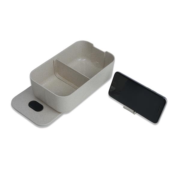 Descrição: Marmita plástica com suporte para celular e divisória interna. Marmita com encaixes laterais para auxiliar na fixação da tampa, possui suporte interno para divisão de alimentos, suporte de encaixe horizontal para celulares e tampa com borracha removível para saída de vapor. O suporte de celular também é utilizado como trava para a tampa.