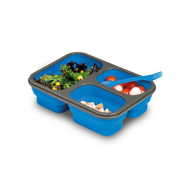 Marmita retrátil em silicone e PP com dois compartimentos com capacidade até 390 mL e um até 700 mL. Incluso talher 2 em 1 (garfo e colher). Apta para micro-ondas (retirar a tampa). Food grade. 241 x 176 x 68 mm - Dobrada: 241 x 176 x 40 mm