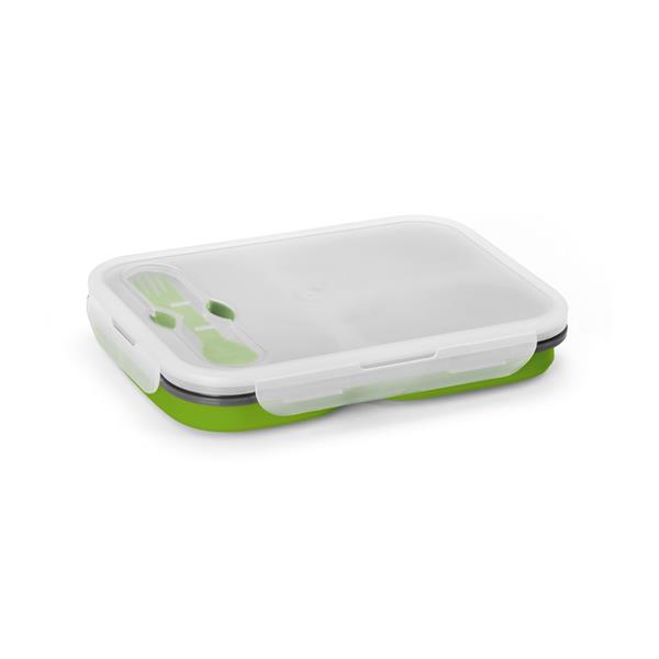 Marmita retrátil em silicone e PP com dois compartimentos com capacidade até 390 ml e um até 700 ml. Incluso talher 2 em 1 (garfo e colher). Apta para microondas (retirar a tampa). Food grade. 241 x 176 x 68 mm | Dobrada: 241 x 176 x 40 mm