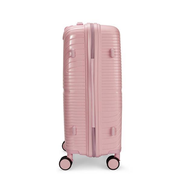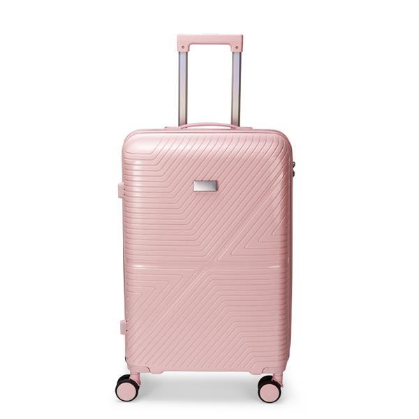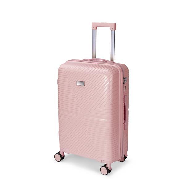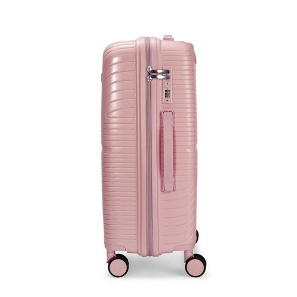 Mala de viagem em plástico resistente com fechamento em zíper e capacidade máxima de 54 litros. Dispõe de compartimento com fechamento em zíper e bolso superior em tela de malha, além de cinta compressora no lado oposto para organização de objetos. Conta com duas alças de mão, uma superior e outra lateral, quatro apoios laterais, dois pares de rodinhas com giro em 360 graus, puxador metálico retrátil com alça plástica e cadeado numérico TSA. Acompanha placa em metal para personalização.