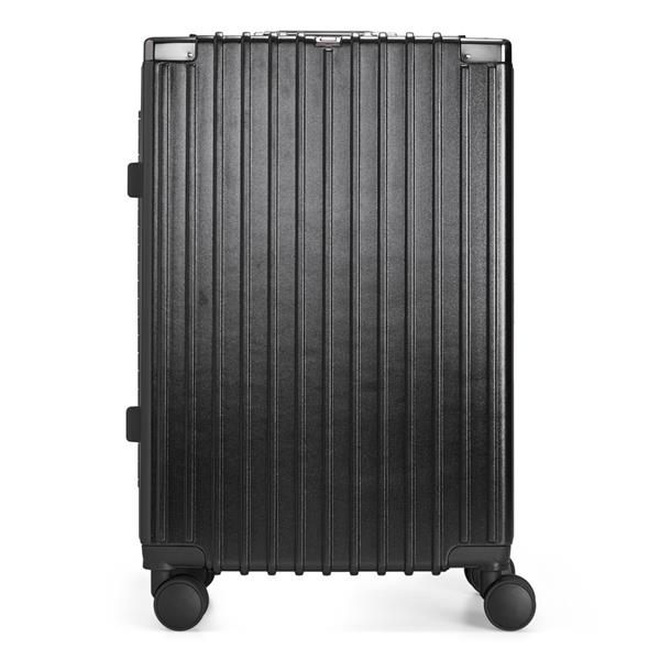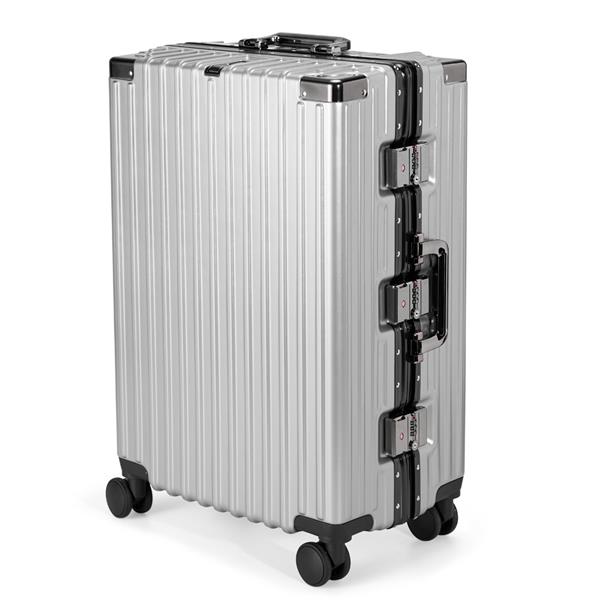 Mala de viagem 77 litros feita em plástico com acabamento em alumínio, contém cadeado numérico TSA. Compartimentos internos com bolso telado, bolso plástico para itens molhados e cinta compressora para roupas. A mala possui duas alças de mãos, puxador retrátil com regulagem de tamanho e suporte para celular, suporte porta bolsa, suporte para copo ou garrafa, quatro rodinhas 360º e apoios laterais.