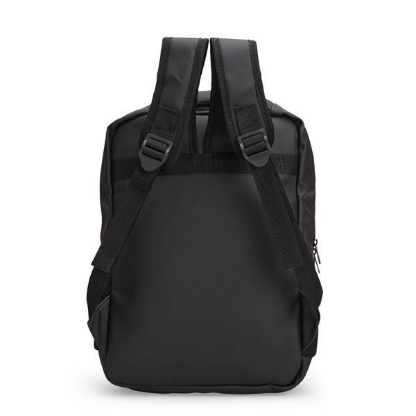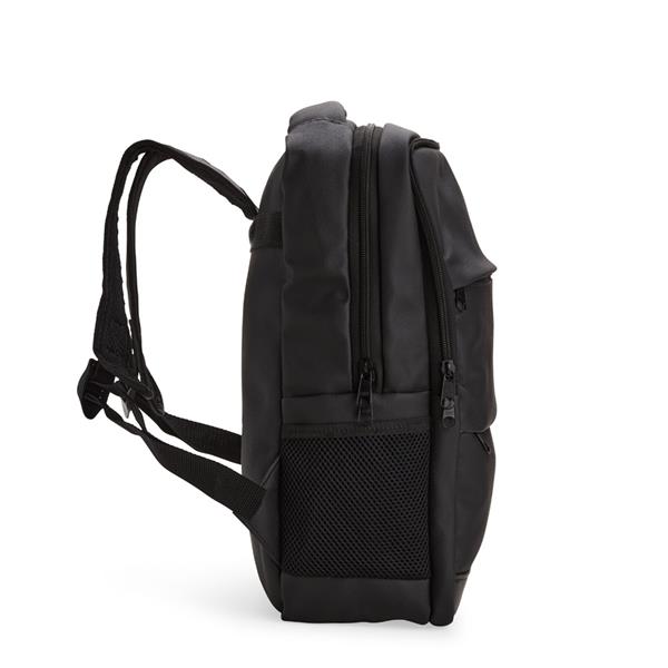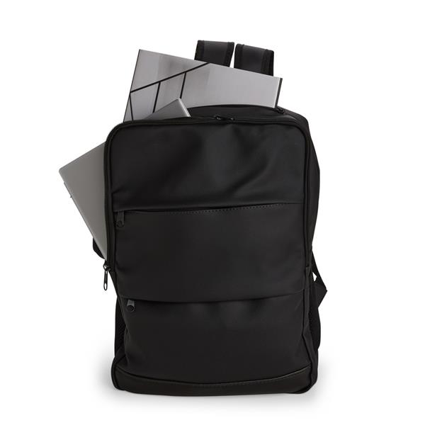 Mochila confeccionada em couro sintético com capacidade máxima de 20 litros. Possui compartimento principal com divisória em malha para notebooks de até 15,6 polegadas. Conta ainda com três compartimentos frontais em tamanhos diferentes, além de dois bolsos em tecido respirável, o mesmo material de revestimento das alças para as costas e alça superior de mão.