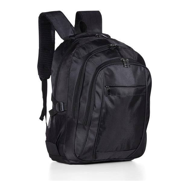 Mochila de nylon 31 litros com quatro compartimentos, sendo o principal com bolso para notebook 156. A mochila possui bolsos laterais em malha, alça de compensação e duas alças de mãos.