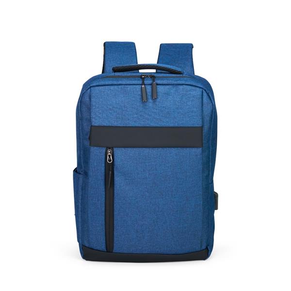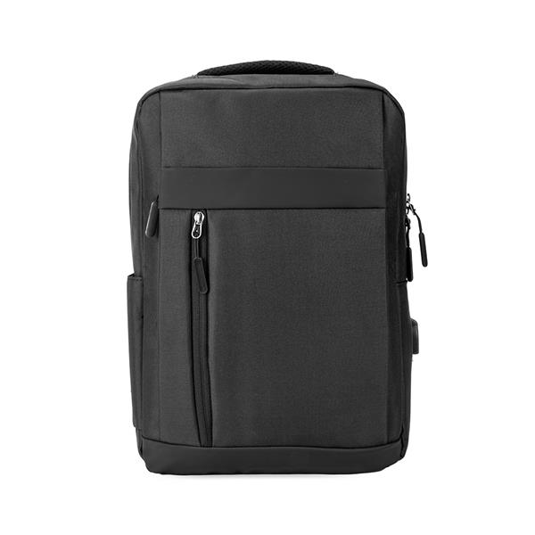 Mochila em nylon Oxford impermeável com detalhes em couro sintético, capacidade para até 14 litros, fechamento em zíper com puxadores em plástico e nylon. Possui compartimento interno com bolsos de tamanhos variados e divisória para notebooks de até 15,6 polegadas. Apresenta dois compartimentos frontais com abertura lateral, além de entrada para cabo USB e bolso lateral aberto. Dispõe também de alça de mão em poliéster reforçado e duas alças para as costas com revestimento em espuma respirável.