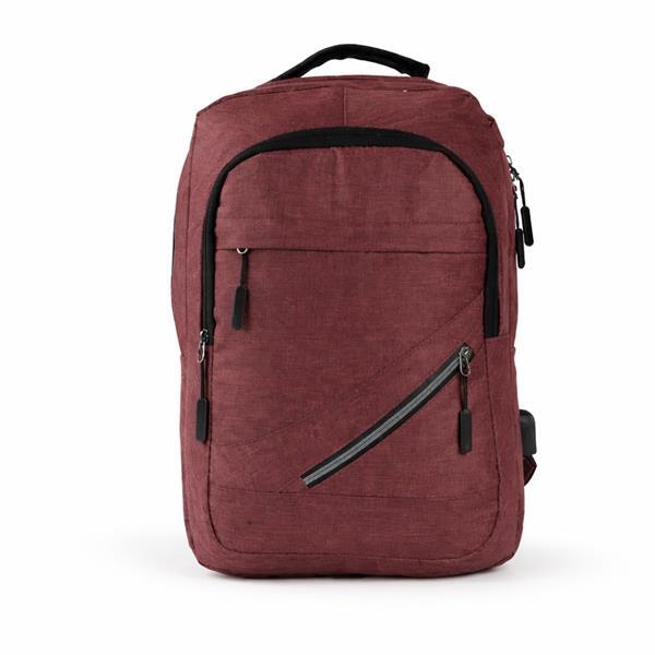 Mochila em tecido Oxford resistente à água com capacidade máxima de 18 litros. Possui compartimento principal com quatro bolsos pequenos e divisória acolchoada para notebook de até 15,6 polegadas. Apresenta um compartimento frontal e dois bolsos em tamanhos diferentes, um deles com faixa refletiva na área do zíper, além de um bolso e um adaptador USB posicionados em laterais opostas. Dispõe de alça superior de mão e duas alças de ombro, estas com revestimento em tecido respirável. Obs.: A posição do adaptador USB pode variar conforme o lote do produto.
