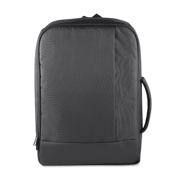 Mochila/pasta em poliéster 300D com detalhe em PU e interior em poliéster 210D. Possui alças lateral e de ombro acolchoadas, alça de mão, engate para mala de viagem, bolso frontal com zíper, compartimento interno para notebook até 15,6” e bolso traseiro para ocultar as alças.