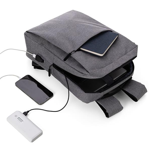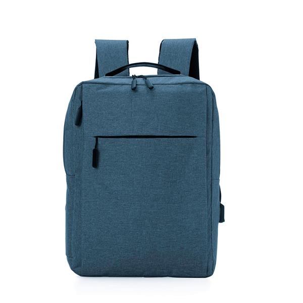 Mochila para notebook em tecido poliéster 600D e interior em 210D. Parte externa: 2 Bolsos frontais com ziper; 1 Bolso lateral; Alça de mão e ombro acolchoadas; Conector USB externo na lateral; Engate para mala de viagem. Parte interna: Compartimento acolchoado para notebook de 39x27cm; Tamanho total do Notebook - 15,6¨ 2 Porta Objetos; 2 Porta Canetas.