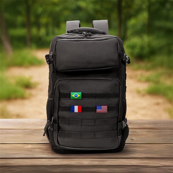 Mochila em Oxford 600D impermeável, fechamento em zíper com fechamento em zíper e puxadores em cordão de nylon, e capacidade de 24 litros. Possui divisória interna para notebooks de até 15,6 polegadas. Conta com dois compartimentos frontais de tamanhos diferentes, sendo um com tiras em velcro para fixação de patches e costura compatível com o encaixe de bolsos modulares, além de dois bolsos laterais em tela de nylon com elástico e cintas compressoras laterais. Dispõe ainda de alça superior e duas alças acolchoadas para as costas. Acompanha plaquinha metálica personalizável.