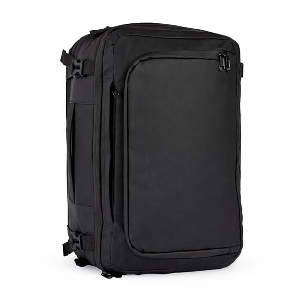 Mochila com capacidade máxima de 28 litros confeccionada em Couro Sintético impermeável. Possui compartimento principal com cinta compressora de engate plástico e bolso em PEVA com fechamento em zíper para objetos úmidos. Conta ainda com dois compartimentos frontais em tamanhos diferentes, sendo um deles com bolso em tela de malha, além de dois compartimentos traseiros, um com espaço para notebook de até 17,3 polegadas e outro para armazenamento das alças de costas, permitindo o uso em formato de mala Dispõe de dois pares de engates compressores nas laterais, além de engate para peitoral e revestimento acolchoado nas alças de mão e na área das costas.