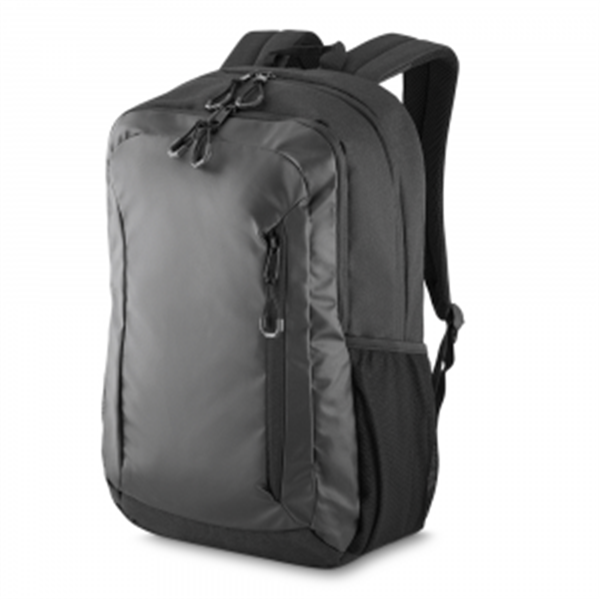 Mochila de nylon com compartimento para notebook e detalhe em tecido sintético. Compartimento grande com bolso interno para notebook, compartimento grande com bolsos para documentos e canetas, compartimento frontal com abertura lateral e bolsos laterais em malha. Zíperes preto com pegadores plásticos, alça superior de nylon, alças ajustáveis para as costas e parte traseira revestidas com espuma para maior conforto. Medidas aproximadas para gravação (CxL): 36 cm x 16 cm Tamanho total aproximado (CxL): 46,5 cm x 36 cm Peso aproximado (g): 467