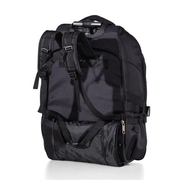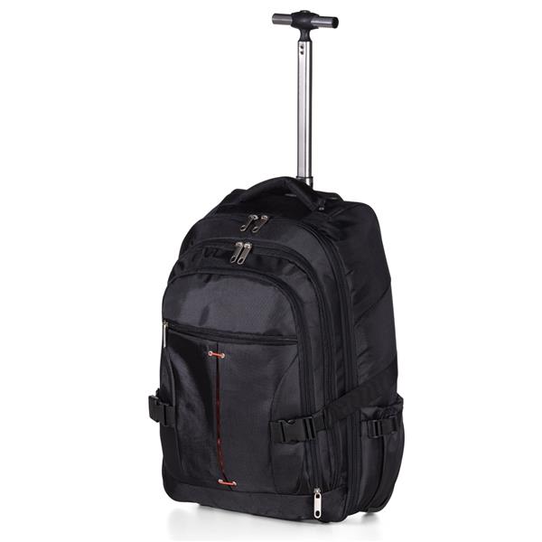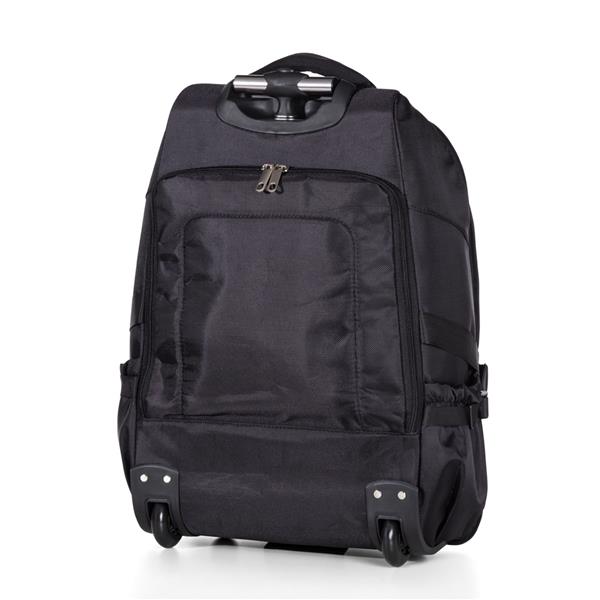 Mochila de nylon com rodinhas. Possui alça de mão, puxador retrátil com regulagem e botão acionador, alças para as costas escondidas no compartimento traseiro com zíper, compartimento mediano com duas divisórias teladas, compartimento mediano também com abertura frontal, possui detalhes laranja e bolsos laterais. O compartimento principal possui bolso para notebook até 15.6 polegadas, forro com zíper. A parte interna conta com um sistema organizatório através de alças de nylon ajustáveis, quando utilizadas impedem que as roupas se movimentem dentro da mochila enquanto à transporta. Possui duas rodinhas e freios em plástico, além de um sistema velcro para junção do compartimento das alças com a parte inferior, tampando as rodinhas enquanto transporta a mochila nas costas. Acompanha plaquinha metálica para personalização. Altura : 59 cm Largura : 45 cm Profundidade : 24 cm Medidas aproximadas para gravação (CxL): 1,2 cm x 4,8 cm Peso aproximado (g): 2158