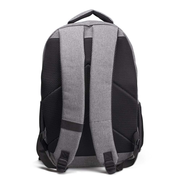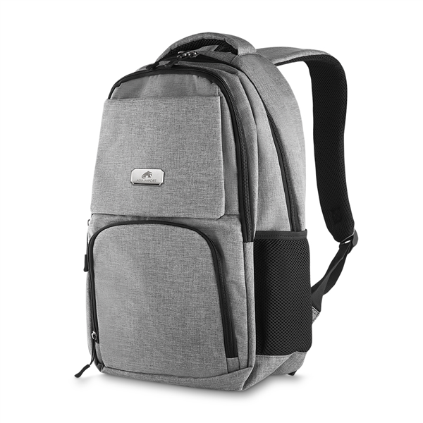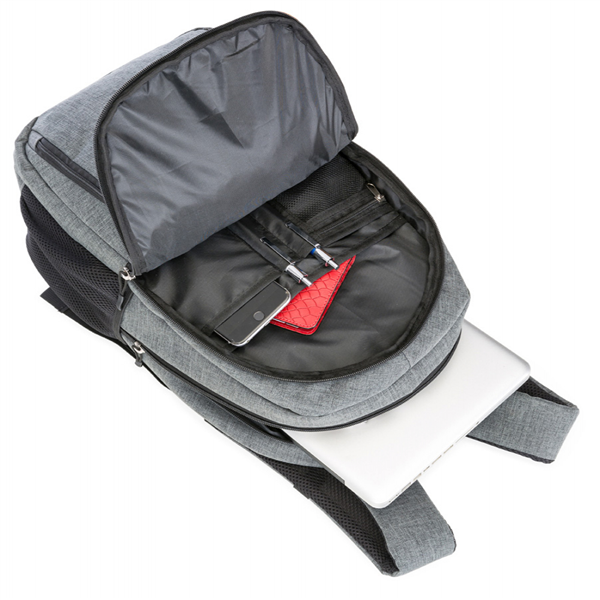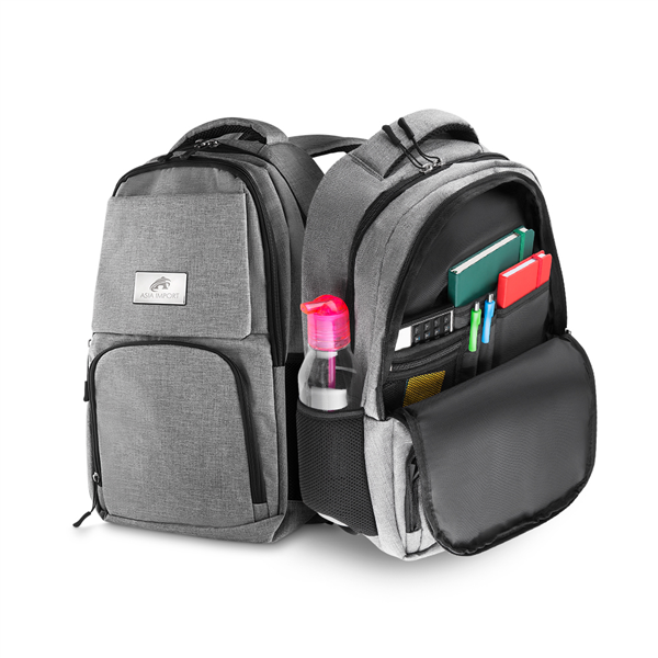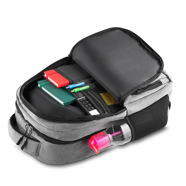 Mochila de nylon com compartimento para notebook. Compartimento grande com bolso interno para notebook até 15.6 polegadas, compartimento mediano com divisórias para canetas, documentos, eletrônicos e compartimentos frontais superior e inferior. Tem bolsos laterais de malha, alça de mão e alças ajustáveis para as costas (possui elástico inferior na alça direita) revestidos com espuma para maior conforto. Acompanha plaquinha para personalização. Altura : 44 cm Largura : 34 cm Profundidade : 19 cm Medidas aproximadas para gravação (CxL): 1 cm x 3,8 cm Peso aproximado (g): 629