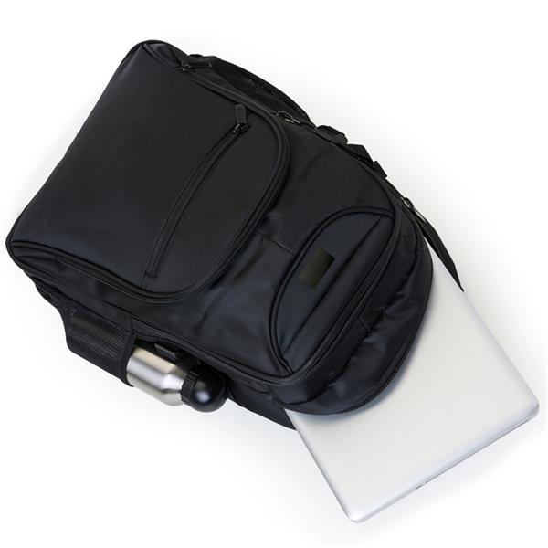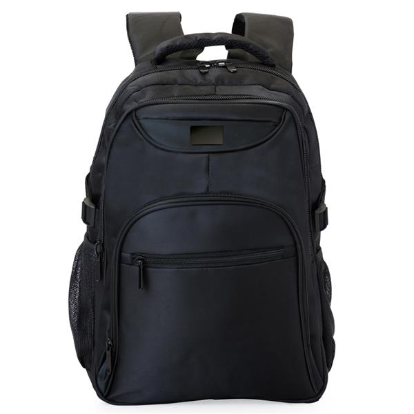 Mochila de nylon 30 litros com cinco compartimentos, sendo o principal com bolso para notebook 14. Com divisórias internas para acessórios, a mochila possui bolsos laterais em malha, alça de compensação, duas alças de mãos e área costada com revestimento espumado. Acompanha plaquinha metálica grafite com acabamento espelhado. Altura : 45 cm Largura : 31 cm Profundidade : 23 cm Medidas aproximadas para gravação (CxL): 2 cm x 3 cm Peso aproximado (g): 768
