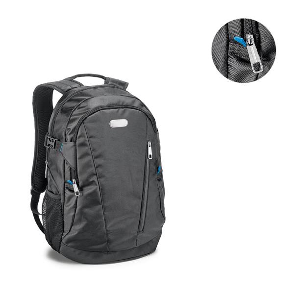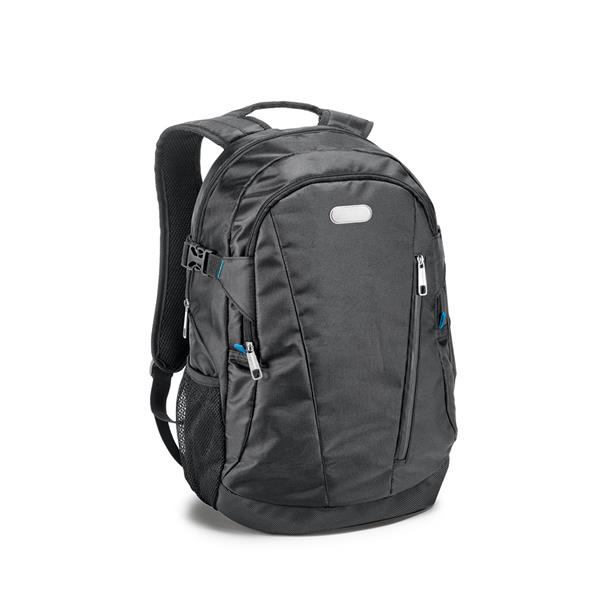 Mochila para notebook em 840D jacquard com dois compartimentos forrados. O compartimento posterior tem divisória almofadada para notebook até 15.6'' e o compartimento frontal diversos bolsos interiores. Bolso lateral em tela e bolso frontal. Parte posterior almofadada, com sistema de apoio acolchoado para as costas e alças almofadadas. Placa metálica removível com imã, para fácil gravação. 305 x 470 x 180 mm - Placa: 50 x 20 mm