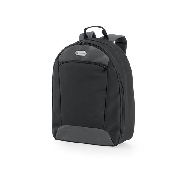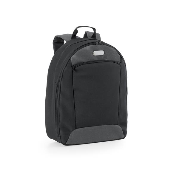 Mochila para notebook. 600D2Tone e 300D. Compartimento com divisória almofadada para notebook até 14''. Interior forrado e almofadado, com diversos bolsos. Bolso frontal. Parte posterior e alças almofadadas. Placa metálica removível com imã, para fácil gravação. 325 x 435 x 135 mm - Placa: 50 x 20 mm