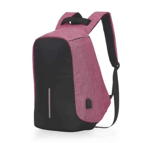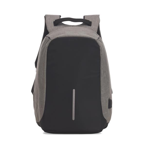 Mochila anti-furto de poliéster. Pensando na segurança do usuário foi confeccionado o compartimento principal na área traseira, impossibilitando a abertura do produto mesmo com a mochila na costa do usuário. Possui dispositivo com entrada USB na parte externa com cabo USB acoplado internamente; permitindo a conexão de um carregador portátil na área interna e a conexão de um eletrônico na área externa, viabilizando a carga e utilização do eletrônico enquanto caminha. Área interna do compartimento principal: bolso para notebook de 15,6 polegadas, bolso para tablet, quatro bolsos para acessórios, possui nas laterais internas sistema de velcro, maximizando a segurança da mochila. Parte frontal com faixa refletiva, alças para as costas ajustáveis revestidas com espuma para um maior conforto sendo uma delas com bolso de zíper, alça para mãos e alça horizontal para encaixe em malas de viagem. Altura : 44 cm Largura : 33,5 cm Profundidade : 17 cm Medidas aproximadas para gravação (CxL): 21 cm x 21 cm Peso aproximado (g): 707