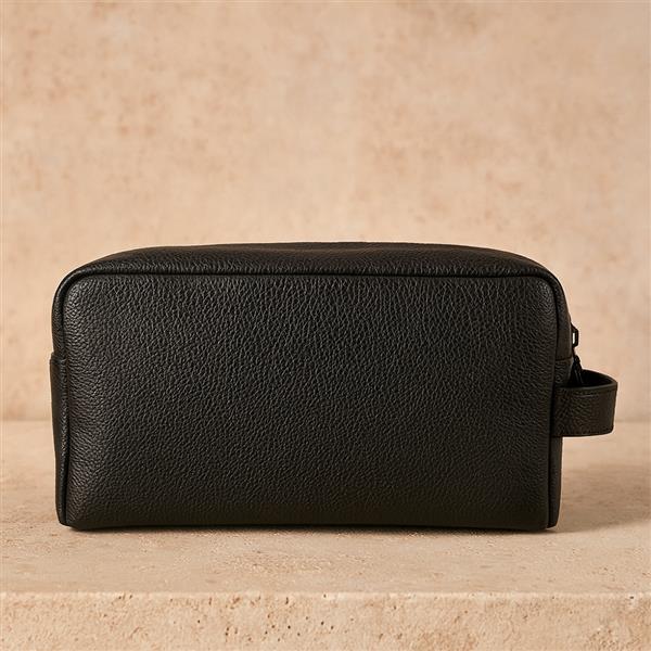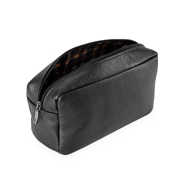 Nécessaire em couro, com fechamento em zíper, alça lateral de mão e plaquinha presa a cordão de nylon.