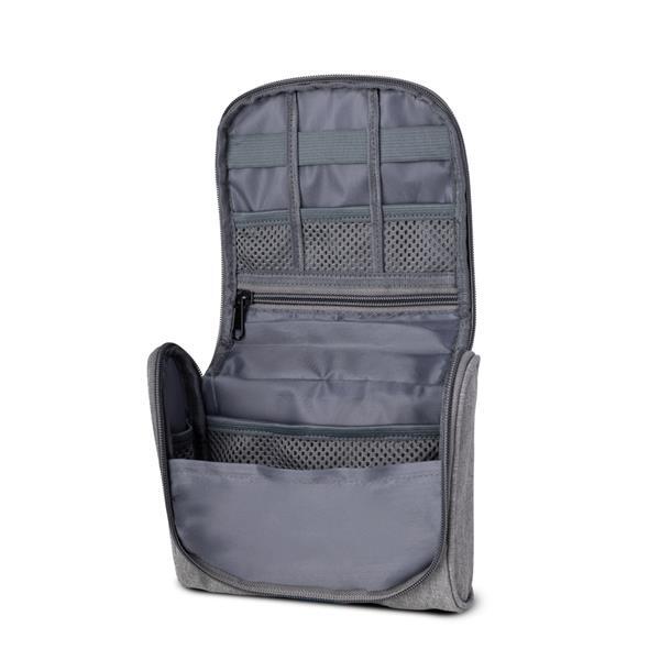 Necessaire confeccionada em poliéster 300D no material externo e poliéster 210D/Mesh no material interno. Fechamento por zíper e divisórias internas. Capacidade de 1,7 Litros.