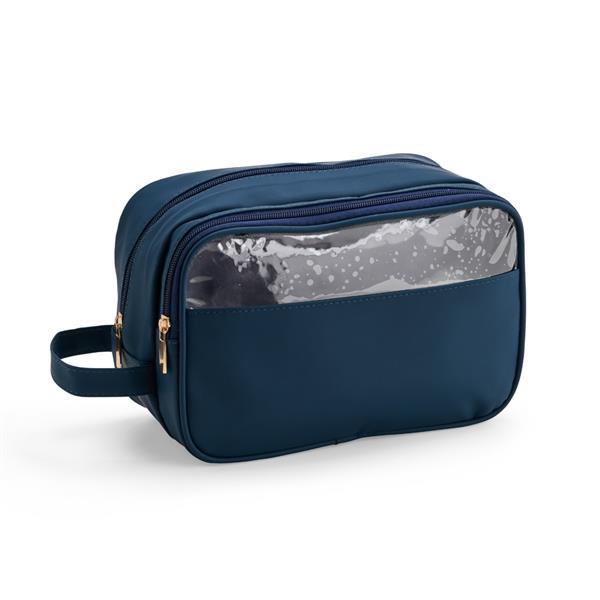 Nécessaire confeccionada em filme sintético de poliuretano impermeável. Possui dois bolsos no compartimento interno principal, sendo um com fechamento em zíper e outro em tela de nylon. Dispõe ainda de compartimento frontal com viseira e revestimento interno em PVC, ideal para guardar itens molhados. Altura : 16 cm Largura : 25 cm Profundidade : 10 cm Peso aproximado (g): 229