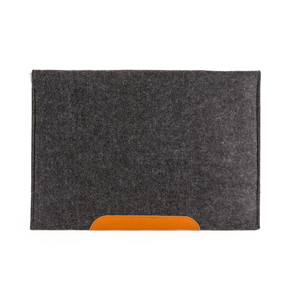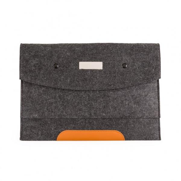 Pasta envelope com forro e uma divisória. Tecido de feltro com detalhe em couro sintético e dois botões pretos superiores. Acompanha placa metálica para personalização. Medidas aproximadas para gravação (CxL): 1,9 cm x 5,8 cm Tamanho total aproximado (CxL): 25,5 cm x 36,4 cm Peso aproximado (g): 142