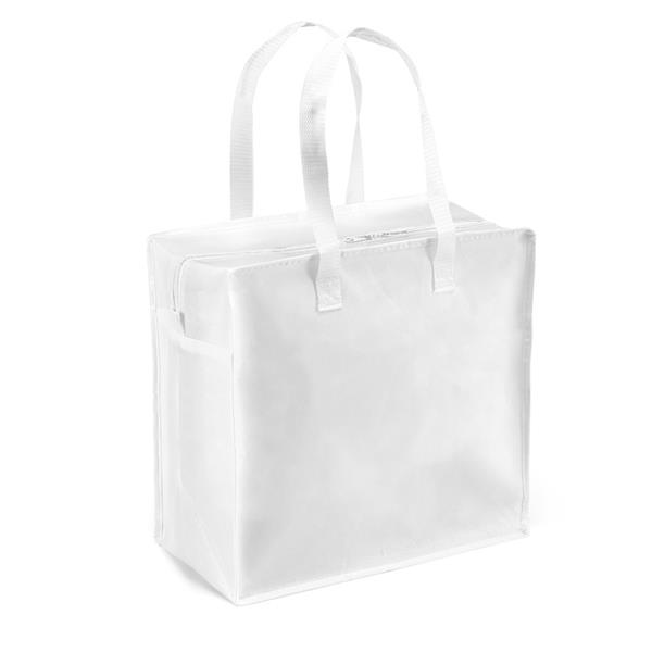Sacola. Non-woven laminado: 140 g/m². Fecho zíper. Fundo reforçado. Alça para encaixe em trolley. Alça em webbing de 65 cm. 350 x 350 x 200 mm