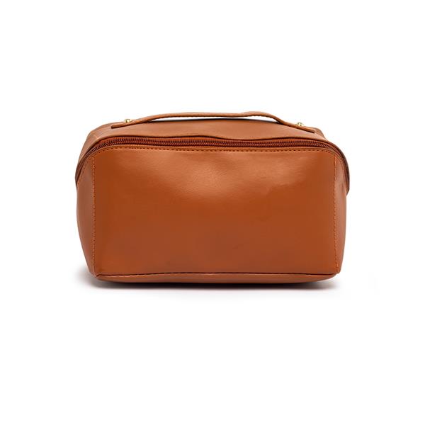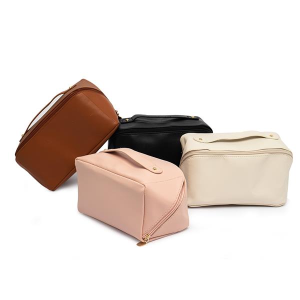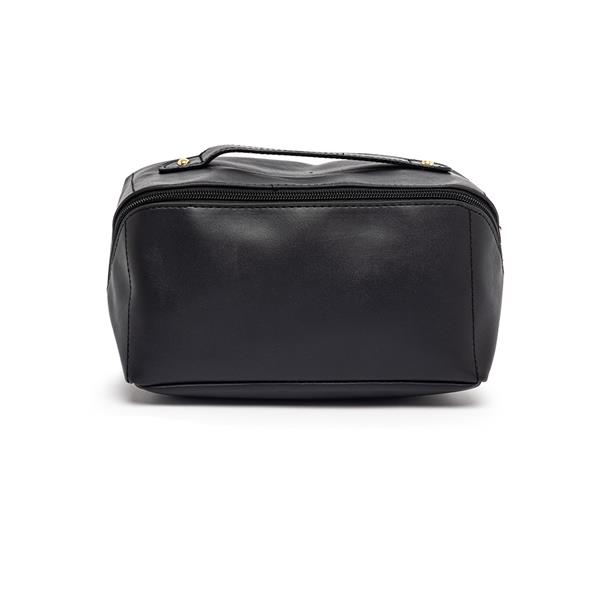 Nécessaire com zíper e couro sintético. Possui abertura larga, 3 bolsos, 3 compartimentos para organização dos itens e alça superior.