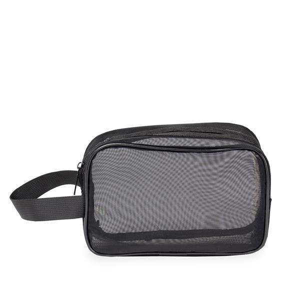 Nécessaire confeccionada em tela de nylon com fechamento em zíper e alça lateral para transporte.