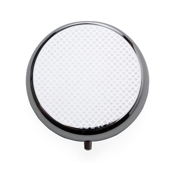 Descrição: Porta comprimido redondo de metal, parte superior externa(tampa) espelhada e lado interno fosco. Parte inferior externa com detalhes em relevo, área interna com três divisórias plásticas, possui um botão para abrir.