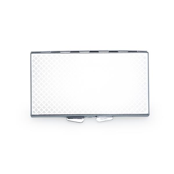 Descrição: Porta comprimido de metal com 3 divisórias. Parte superior espelhada e verso com detalhe texturizado. Parte interna plástica com três divisões.
