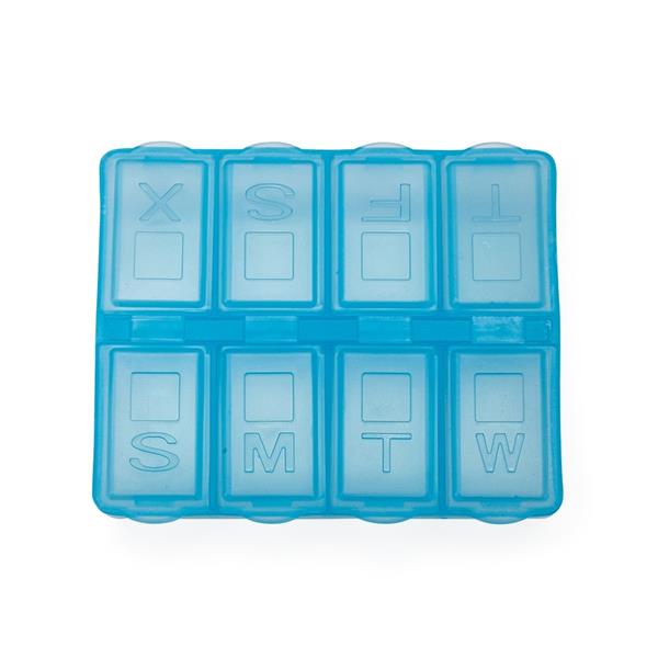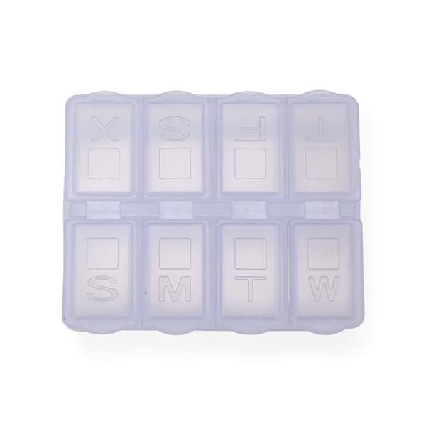 Descrição: Porta comprimido semanal em material plástico. Cada divisória contém a letra inicial referente o dia da semana(em inglês), possui oito divisões sendo a última para comprimido extra.