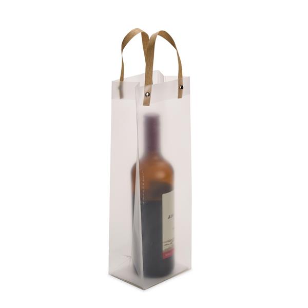 Sacola plástica com formato retangular, acabamento fosco e alças em papelão fixadas por botões metálicos.